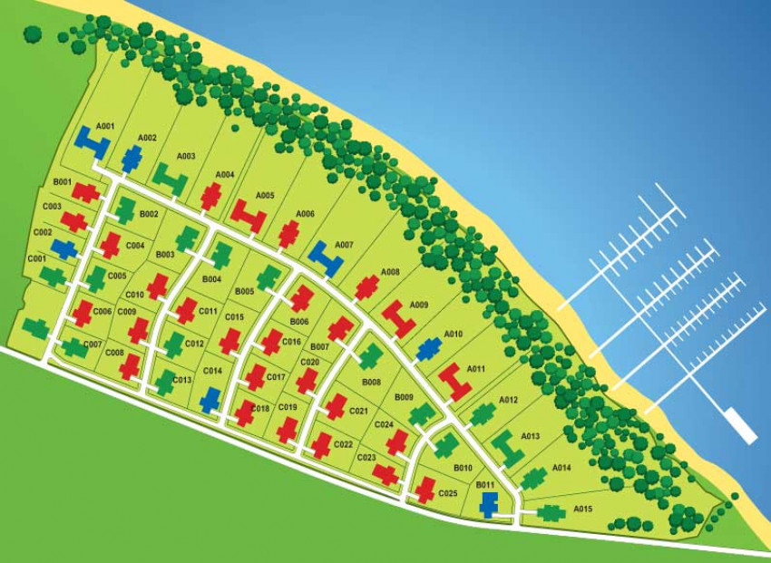 В поселке 51 коттедж. 7 типов домов площадью от 498 до 1038 м. кв. Придомовые участки - от 18 до 56 соток. Все коттеджи – двухуровневые с цокольным этажом. Архитектура коттеджей предполагает обустройство бассейнов и зимних садов. Коттеджи продаются со свободной планировкой. Благодаря тщательно продуманной планировке поселка из каждого коттеджа открывается красивейший вид на воду – расстояние от домов до береговой линии составляет всего 100 метров.