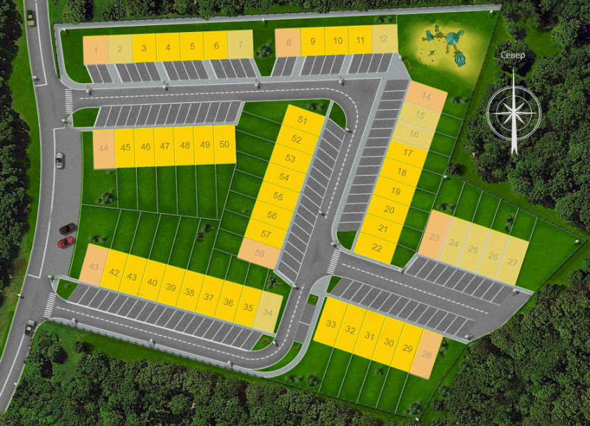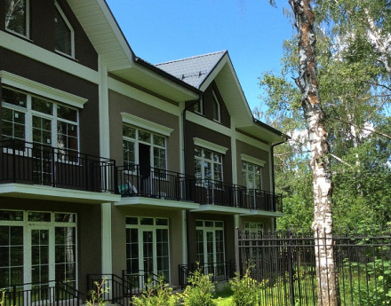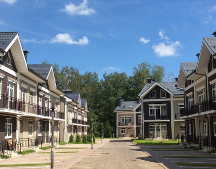 Строительство ведется в стороне от магистрали — окружающий лесной массив надежно защищает от шума и обеспечивает чистый воздух. Поселок застраивается сблокированными кирпичными коттеджами по трем базовым проектам.