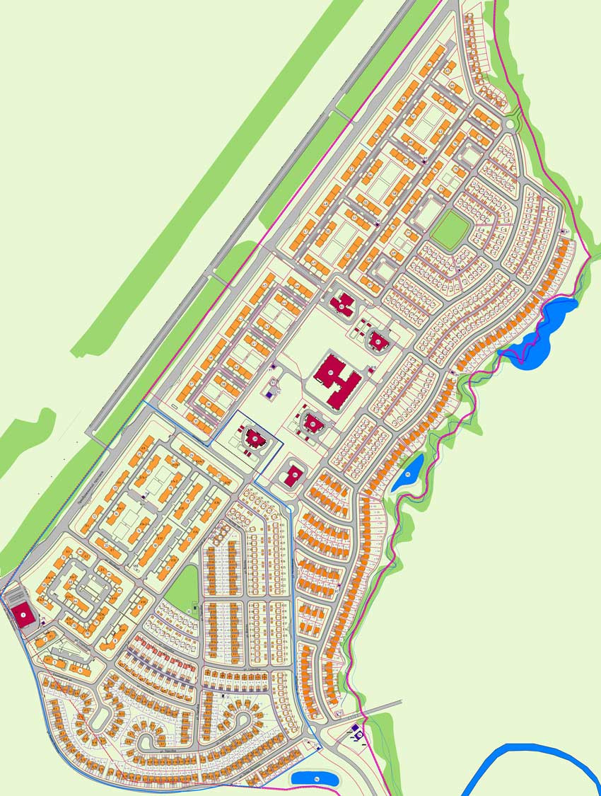Поселок занимает территорию около 1200 гектар, строительство ведется в несколько этапов. Предполагается, что по его окончании общая жилая площадь составит 1700000 кв. метров, а проживать здесь будет 55000 человек.