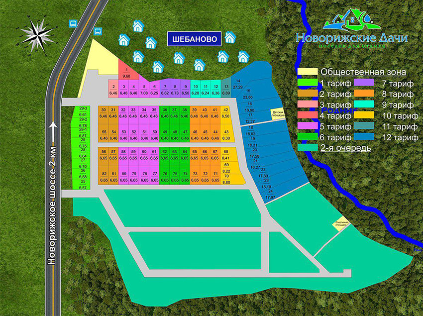 Поселок довольно большой - 181 землевладение размером от 6 соток. Имеются участки с выходом в лес, а самые большие, до 32 соток, расположились на первой линии берега.