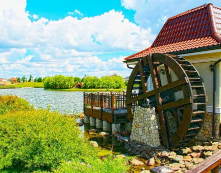 - Пруд с пляжем, лодочной станцией и рестораном на берегу