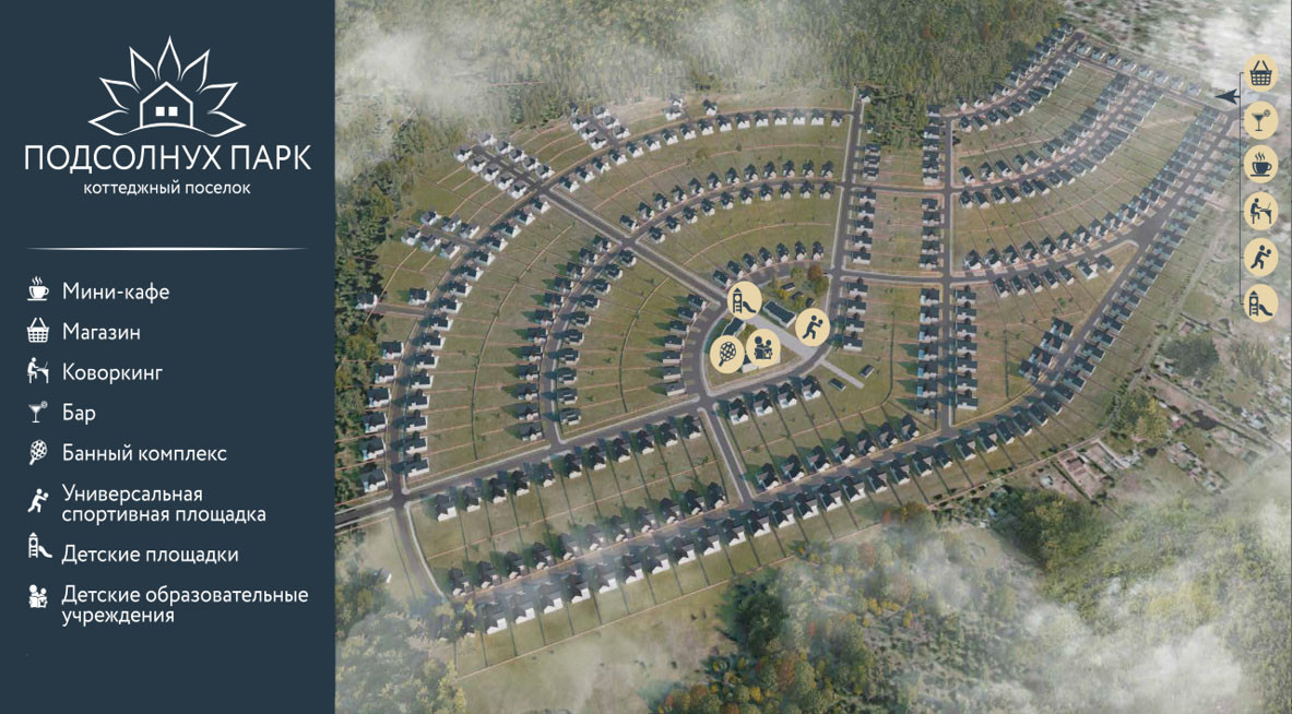 Поселок довольно большой, землевладения реализуются застройщиком с готовыми каменными домами, выполненным по одному из специально разработанных проектов. К коттеджам «Подсолнух Парк» проведены центральные коммуникации, готовы широкие 6-метровые внутренние дороги, установлено ограждение с КПП.