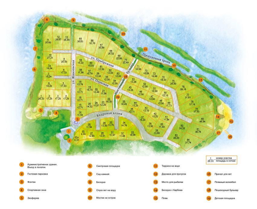 - Инфраструктура: аптека, банкомат, гостевая парковка, детская игровая площадка, зона отдыха, кафе, магазин, пляж, спортивная площадка