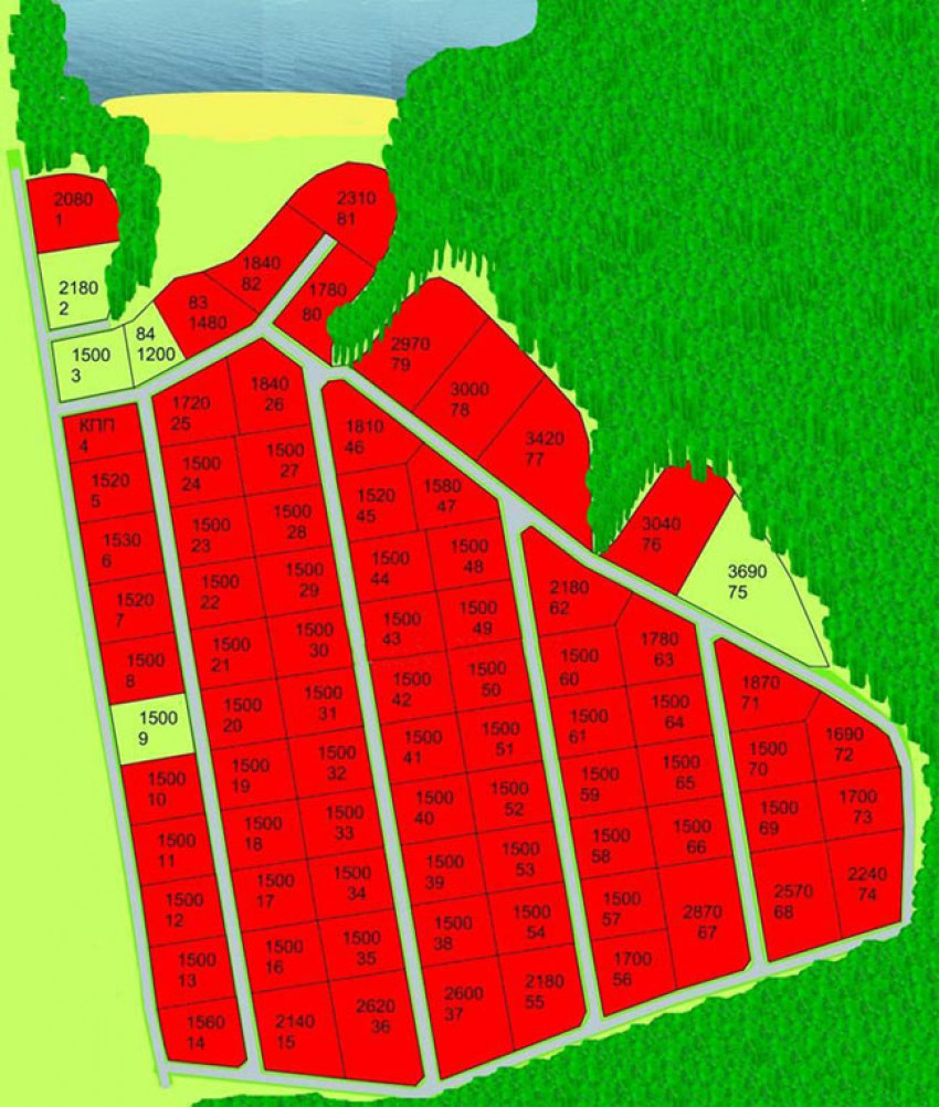 Территория в 17 гектар разделена на 83 землевладения, которые предлагались будущим владельцам со строительным подрядом. Участки просторные, до 30 соток, некоторые имеют отдельный выход в окружающий лесной массив.