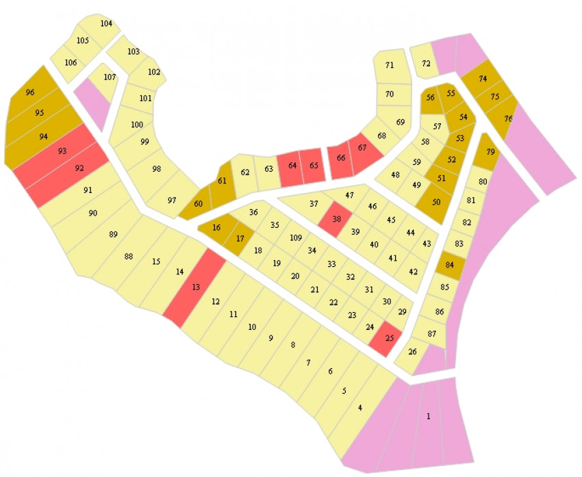 Поселок небольшой — 107 землевладений, предлагаемых без обязательного подряда. Размеры варьируются от 10 соток до полугектара, самые большие участки расположены вдоль берега и имеют свой выход к воде.