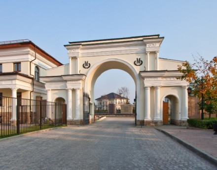 Главный въезд в поселок Резиденция Монолит увенчан триумфальной аркой. Подъездной путь от шоссе к территории резиденций освещен и благоустроен.