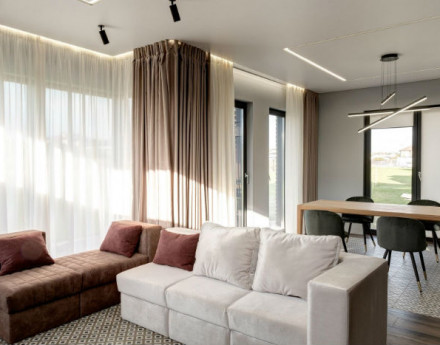 Поселок камерный — всего 22 домовладения, расположившихся на просторных, до 19 соток, участках. Коттеджи «Рига Хаус» выполнены из кирпича в стиле современного европейского пригорода. Реализуются они как подготовленными к чистовой отделке так и в готовности «под ключ». В последнем случае на выбор будущим владельцам предлагается три авторских дизайн-проекта.
