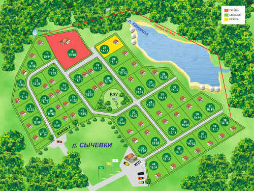 Территория благоустраивается, прокладываются внутренние дороги и асфальтированный проезд от трассы, запланировано строительство гостевых стоянок и административного здания. Гордостью же дачного поселка будет собственный искусственный водоем площадью в два гектара с обустроенной зоной для отдыха.