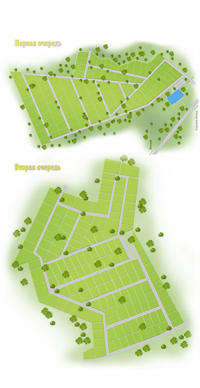 Строительство коттеджей производится в две очереди. Территория поселка разбита на 266 участков, площадь самого маленького землевладения составляет 8 соток, а самый большой участок занимает 25 соток. К коттеджному поселку ведет удобная подъездная дорога. Первая очередь строительства состоит из 110 участков, а вторая – из 156.