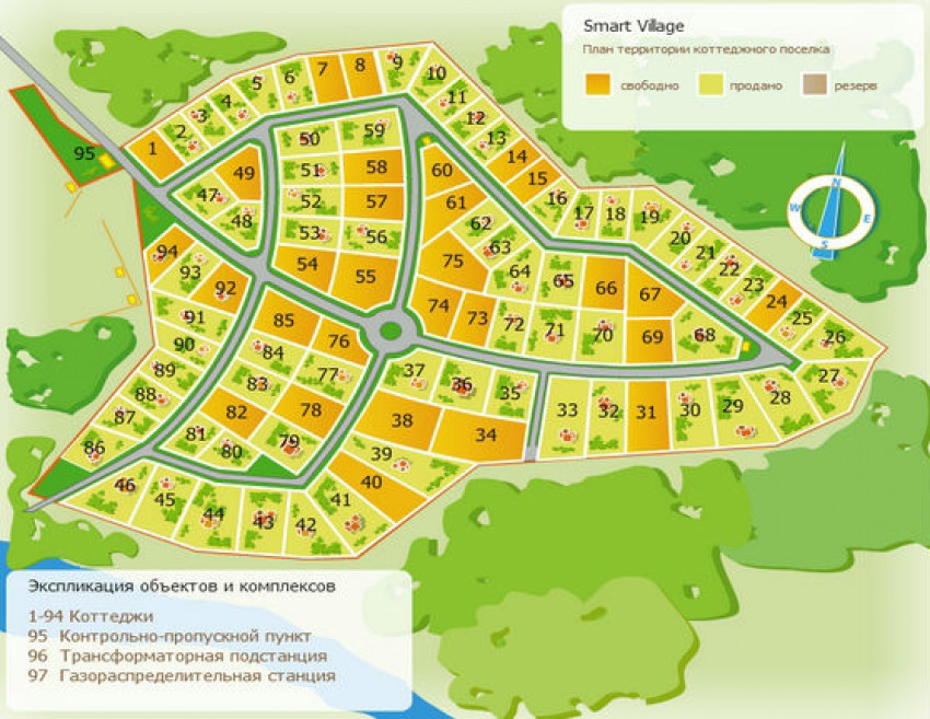 В новом поселке 94 участка размером от 7,6 до 19 соток, предполагается обязательный строительный подряд.