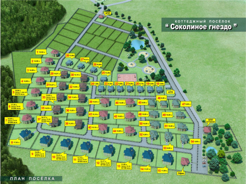 Поселок расположен на территории в 7 гектаров. Минимальная площадь каждого коттеджа равна 180 квадратным метрам, а максимальная – 372. Причем под каждое здание предусмотрен участок, площадью 9-23 соток. Территория коттеджного поселка находится под охраной по всему периметру.