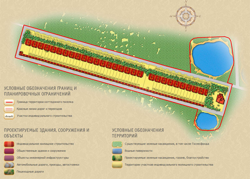 В поселке предполагается строительство административного здания. Кроме этого, спланированы декоративные водоемы и детская игровая площадка. Для гостей предусмотрено строительство удобной автостоянки.