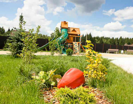 Территория огорожена, имеется два въезда с КПП, рядом с каждым оборудована гостевая парковка. Обустроена большая зона отдыха, места для барбекю, игровой городок и спортивные площадки.