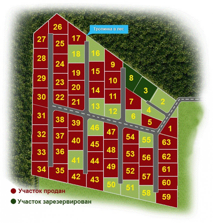 Поселок небольшой - всего 63 землевладения размером 10-12 соток. Предлагаются они без строительного подряда. В поселок проведено электричество, готовы внутренние проезды и ограждение с КПП, налажена работа службы охраны.