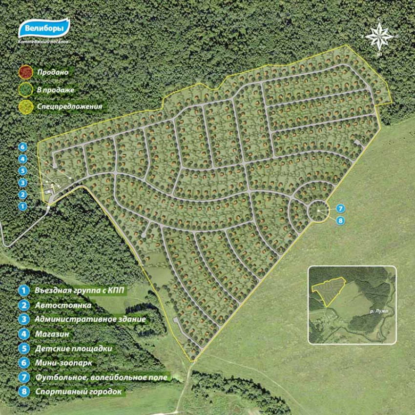 Поселок большой, территория его занимает 37 гектар, два из которых отведены под общественные зоны. Землевладения наиболее востребованных для загородного строительства размеров, реализуются без подряда.