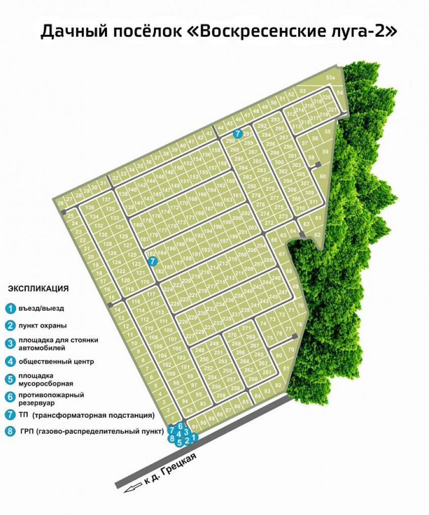 Закрытая, охраняемая территория в 30 гектар разделена на землевладения, предлагаемые без обязательного подряда. К участкам «Воскресенские луга-2» подводится электричество и газ, в планах — благоустройство общественных зон. Документы на землю подготовлены.