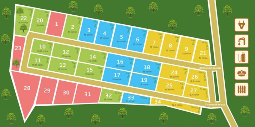 Поселок совсем небольшой — территория чуть более 5 гектар разделена на 34 землевладения размером от 11 до 30 соток. Все документы о собственности готовы.