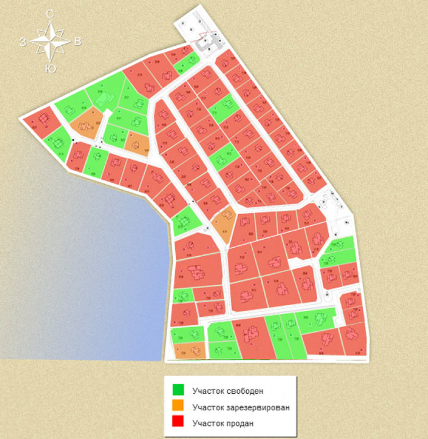 Территория поселка занимает 21 гектар — 78 землевладений от 12 до 48 соток. Предлагаются они со строительным подрядом, при планировании удачно использованы особенности природного рельефа, так что с каждого участка открываются панорамы озера.