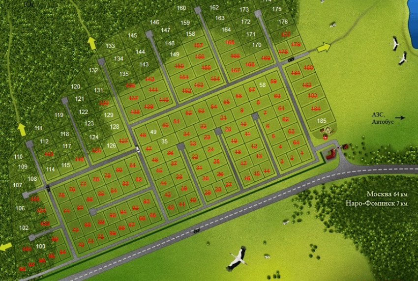 Территория разделена на 108 участков, большинство из них имеет размер 6-8 соток, но при желании можно приобрести землевладение побольше, до 15 соток, или же объединить соседние.