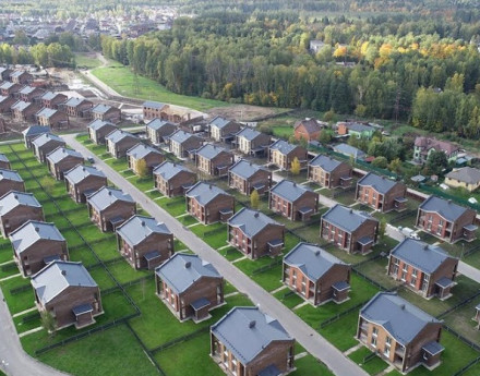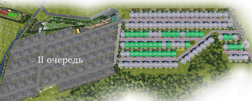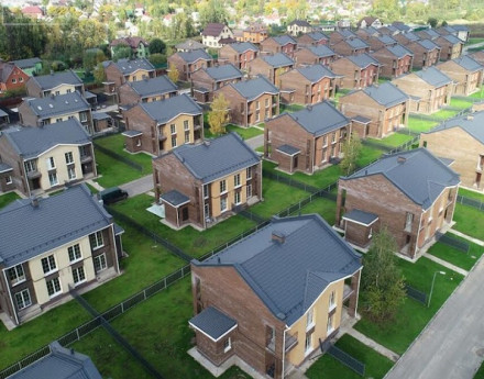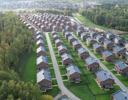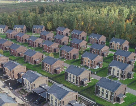 Поселок большой, запланировано две очереди работ. Закрытая территория застраивается как индивидуальными коттеджами, так и дуплексами — все дома выполнены из керамического кирпича и выдержаны в едином архитектурном стиле.