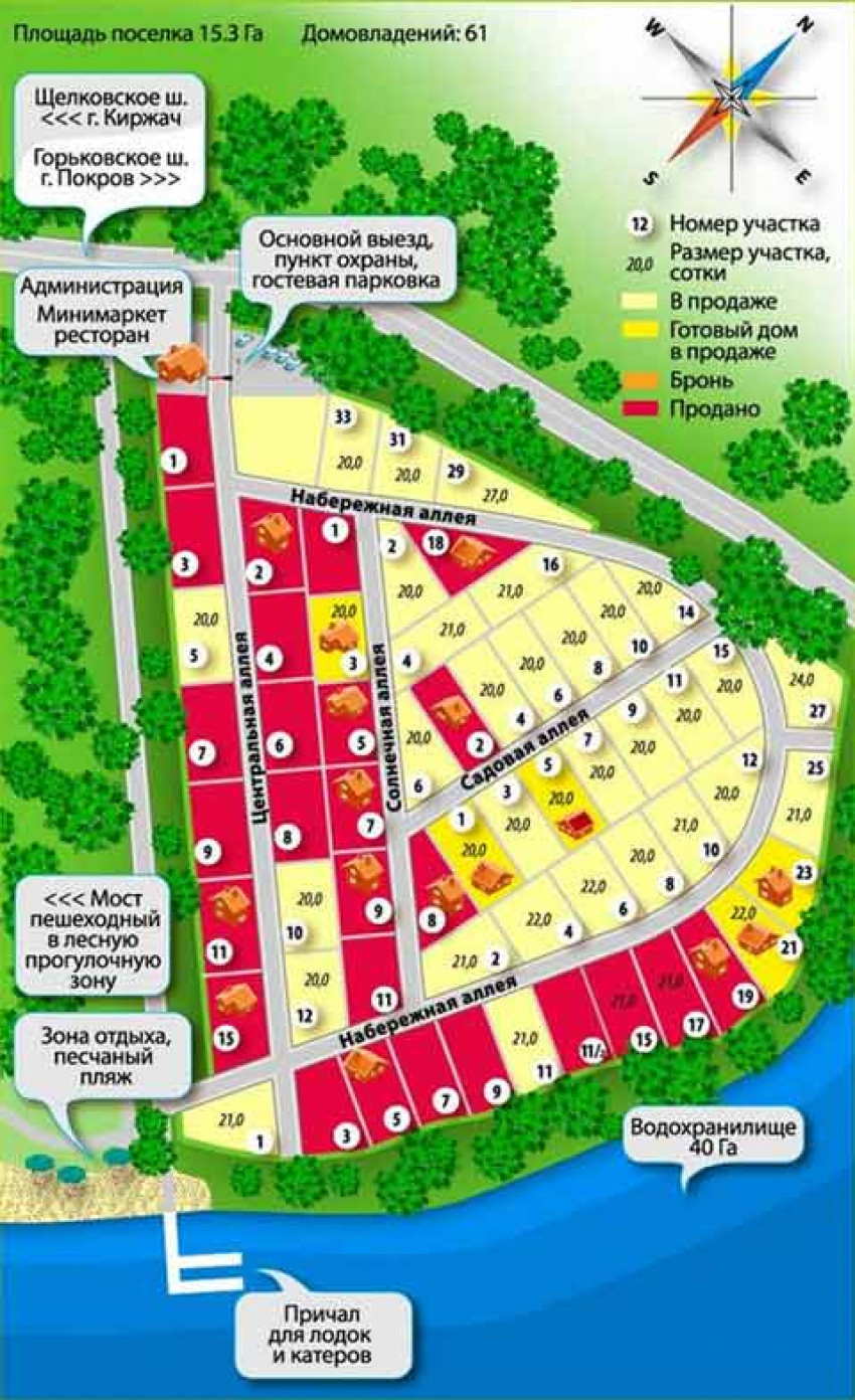 Поселок строится на берегу водохранилища, а кругом величественный лес, красота необыкновенная. Да еще и пляж, круглогодичная рыбалка, и много-много воды для водного спорта. В поселке есть все необходимые коммуникации, работает сервисная служба, охрана.