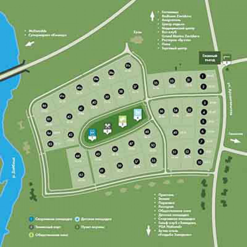 Территория поселка охраняется, на въезде установлен КПП. Внутреннее благоустройство включает большую зону отдыха, открытый теннисный корт, спортивную и детскую площадки и гостевую парковку.