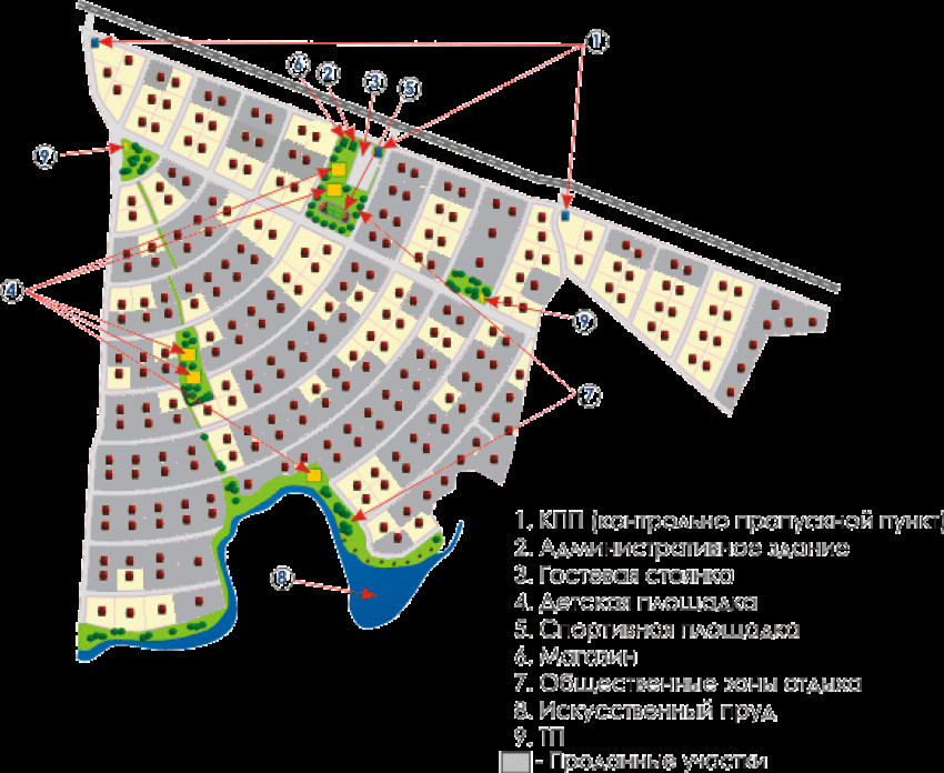 Въезд в поселок осуществляется через контрольно-пропускной пункт, поскольку вся территория огорожена и находится под круглосуточной охраной.