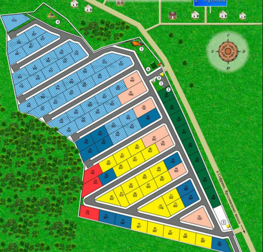 Территория разделена на 80 участков без обязательного подряда. Размер их составляет от 6 до 10 соток. Все документы о собственности уже готовы. Подведено электричество, проложены внутренние дороги, установлено общее ограждение.